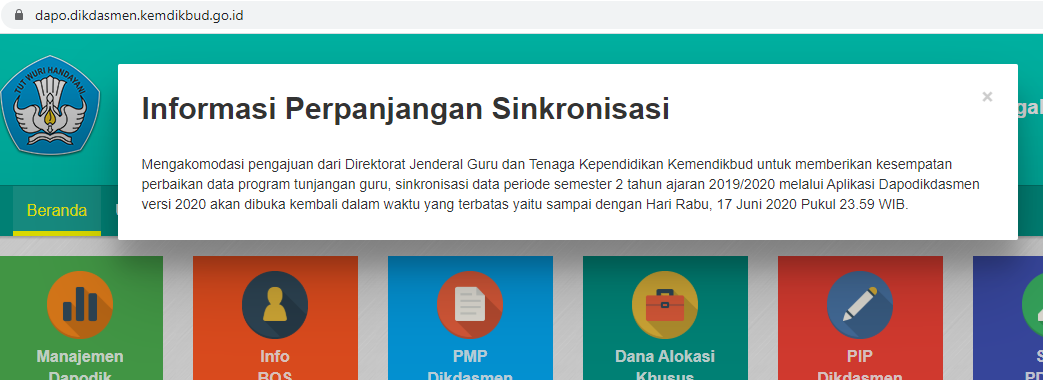 Mengakomodasi pengajuan dari Direktorat Jenderal Guru dan Tenaga Kependidikan Kemendikbud untuk memberikan kesempatan perbaikan data program tunjangan guru, sinkronisasi data periode semester 2 tahun ajaran 2019/2020 melalui Aplikasi Dapodikdasmen versi 2020 akan dibuka kembali dalam waktu yang terbatas yaitu sampai dengan Hari Rabu, 17 Juni 2020 Pukul 23.59 WIB.