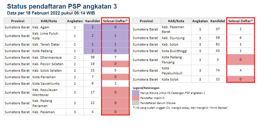 Oleh sebab itu, kami mohon bantuan Bapak dan Ibu untuk mendorong Kepala Sekolah yg memenuhi syarat utk segera mendaftar sampai status terdaftar (submit), kecuali yg utk Akt 1 (Agam, Tanah Datar, 50 Kota, dan Padang) yg mendaftar hanya yg sdh pada posisi cadangan (masuk perengkingan pd akt 2).